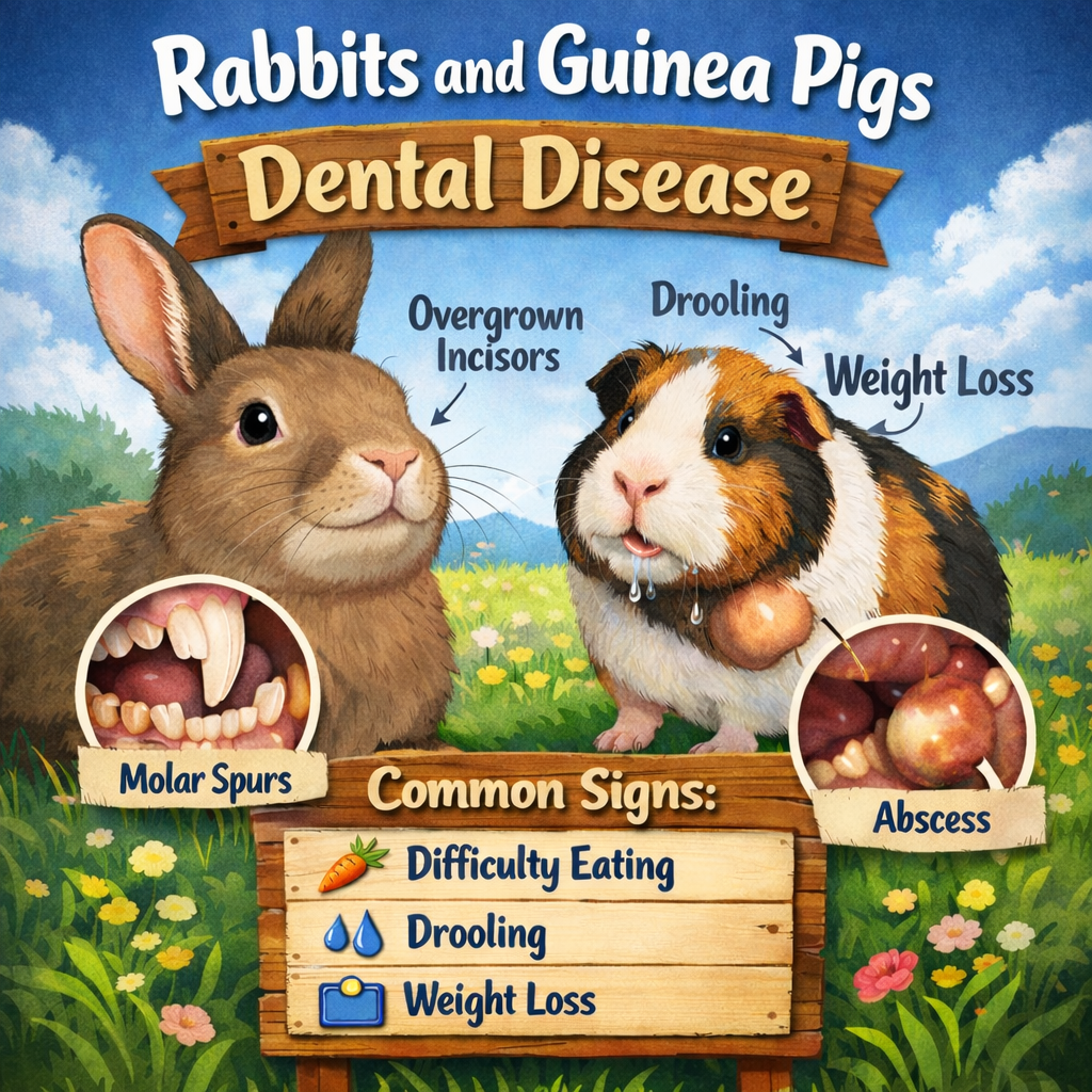 The most common disease affecting both is the development of poor teeth alignment or the development of sharp ridges on the edge of the teeth. Improper alignment of the teeth allows the molars to overgrow trapping the tongue and making it difficult or impossible to chew or swallow. The development of sharp ridges on the margin of teeth causes laceration of the tongue and cheeks. The pain associated with these points causes the rabbit or guinea pig not to eat. Both conditions cause similar symptoms. The common symptoms seen are: